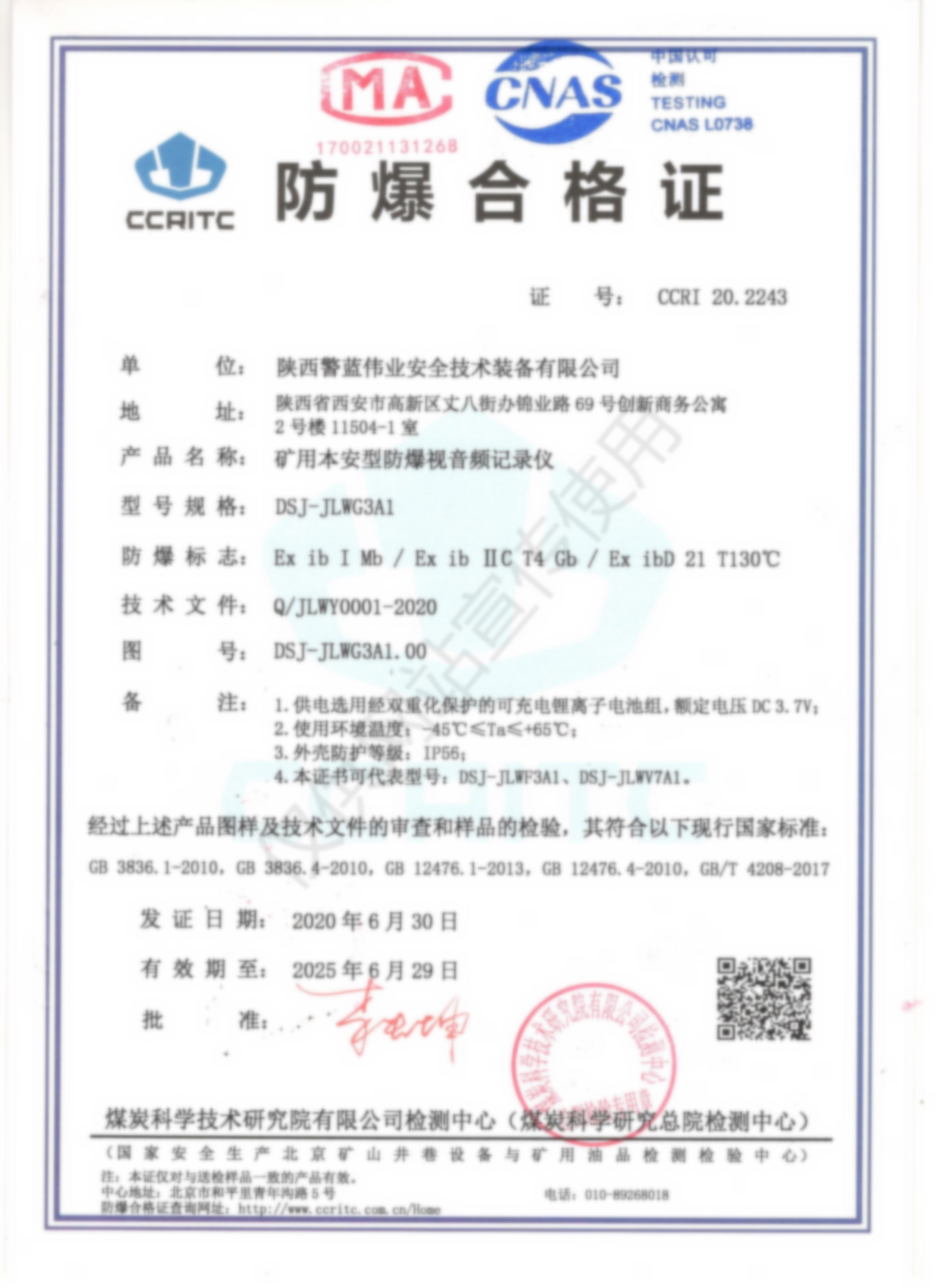 礦用本安型防爆視音頻記錄儀DSJ-JLWG3A1檢驗報告